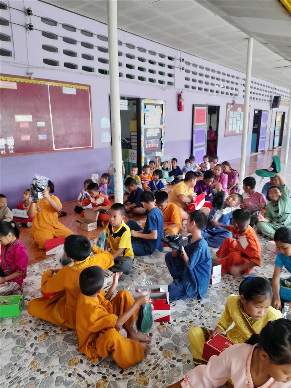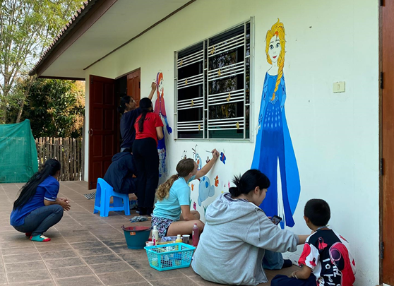 Last year, Year 3 supported Thomas House in three main ways. Through our Christmas donation drive, we collected sports equipment, stationery and paint supplies. The paint was later used by a visiting group of Bangkok Patana secondary students to paint two murals onto the walls of the school. We also held two fundraising events during the year - a Christmas card sale and our annual Timestable-athon - raising over 135,000ThB. With this money, we sponsored two students through two years of schooling, we bought and installed fans in classrooms, and we bought new school-shoes for over 200 students across three schools.