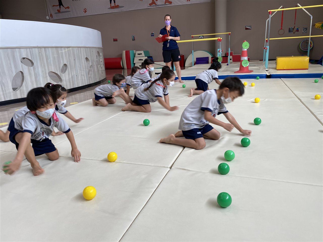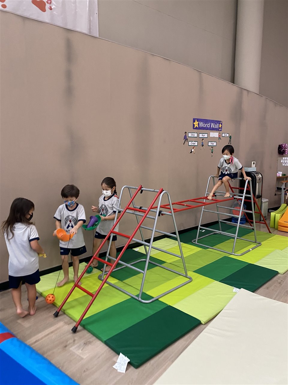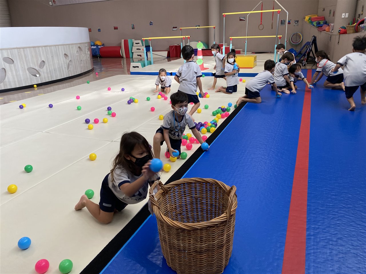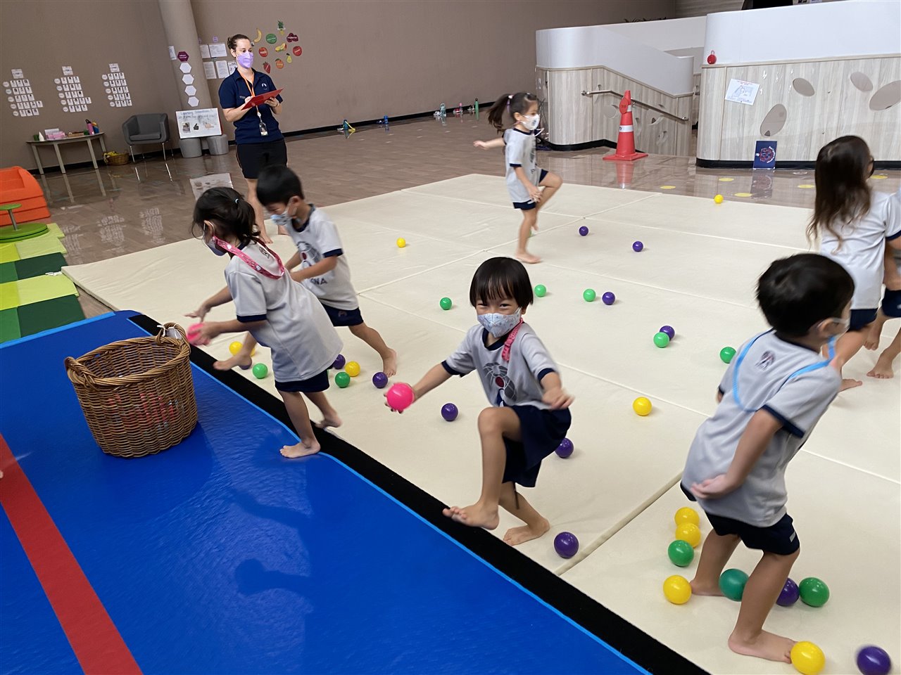 The children loved playing the rainbow balls game. They are asked to move by hopping, crawling and skipping to get the different coloured balls. It was so much fun! After this game, the children worked in small groups to practice these important gross motor skills.