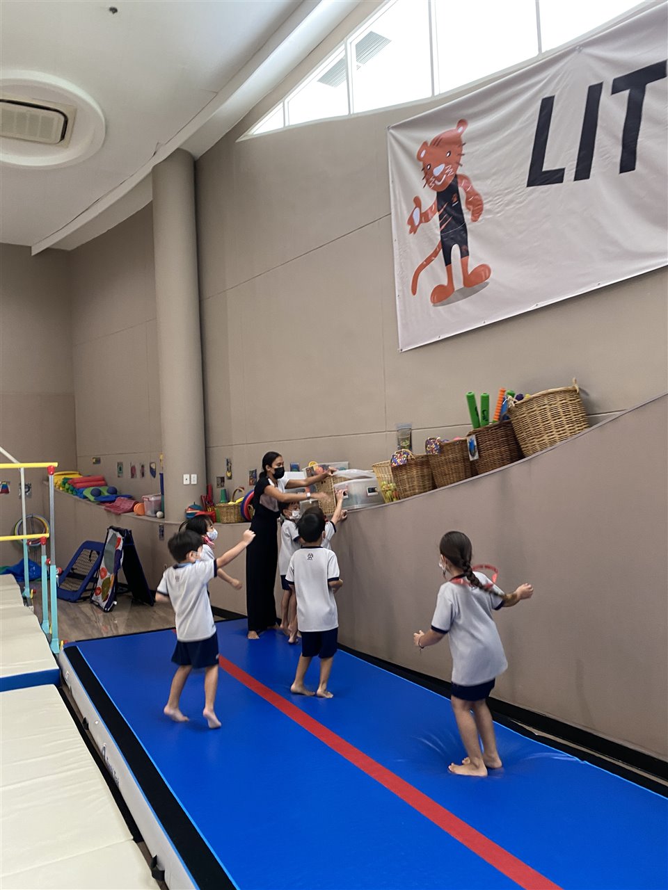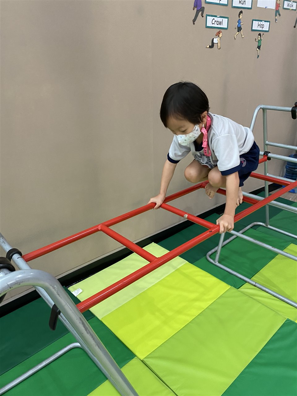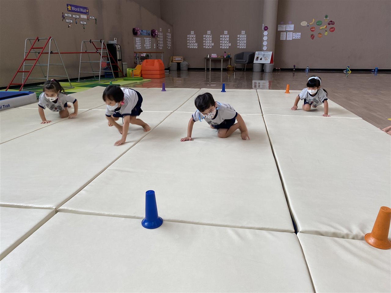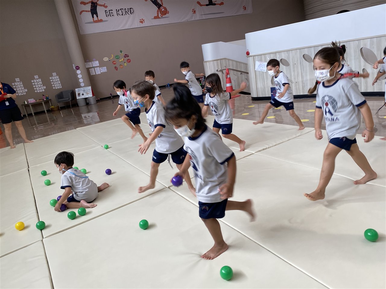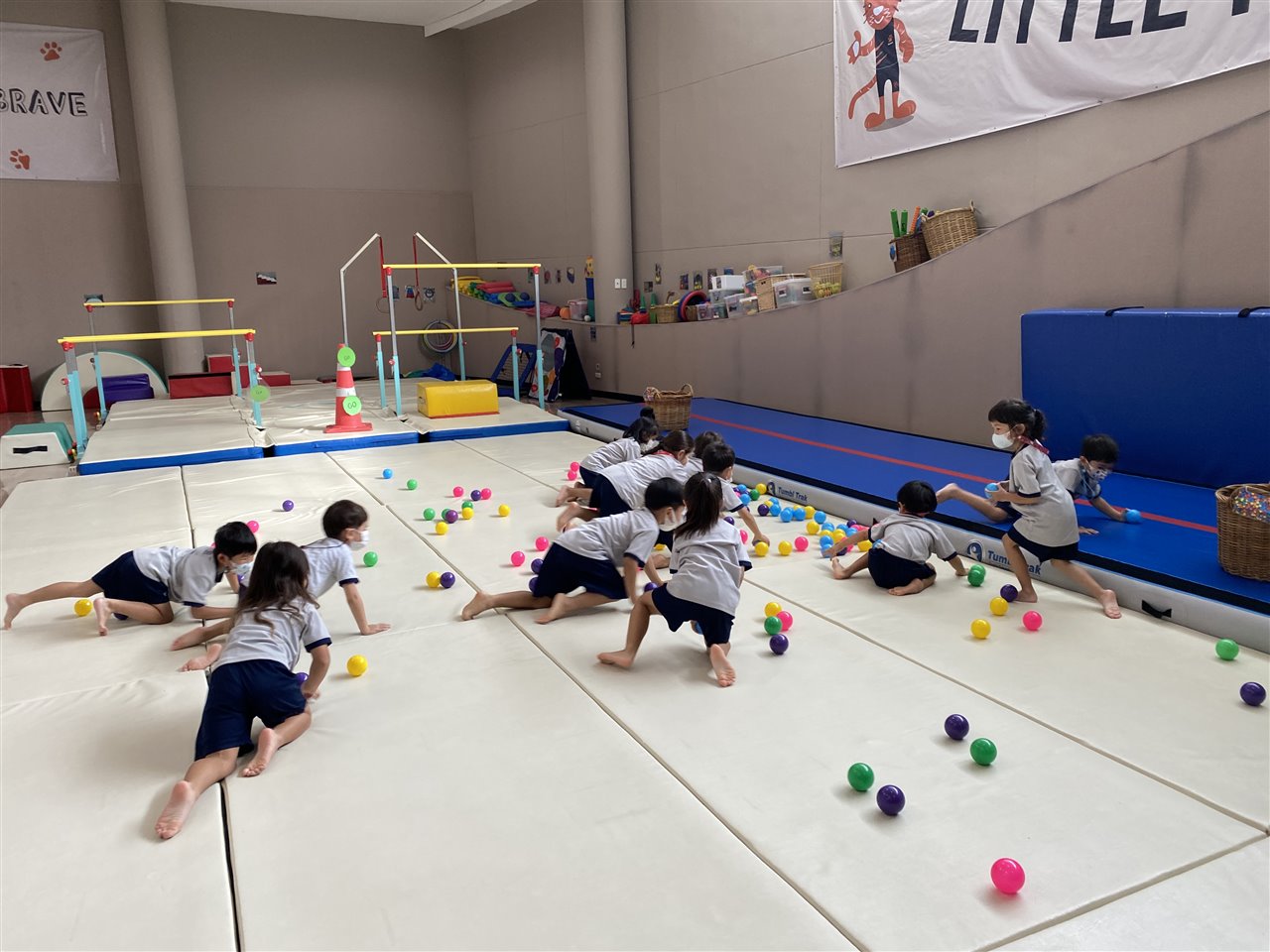 The children loved playing the rainbow balls game. They are asked to move by hopping, crawling and skipping to get the different coloured balls. It was so much fun! After this game, the children worked in small groups to practice these important gross motor skills.