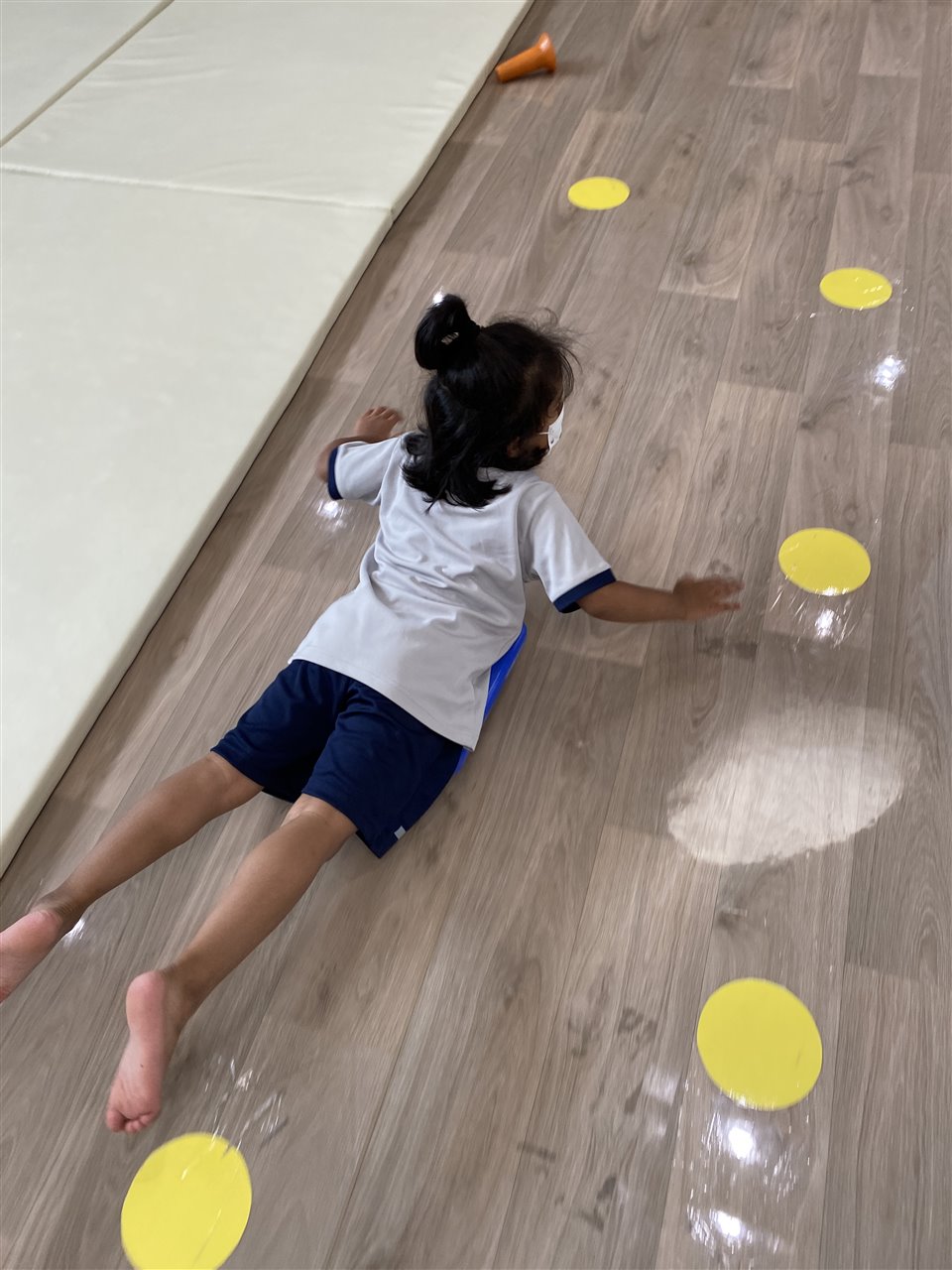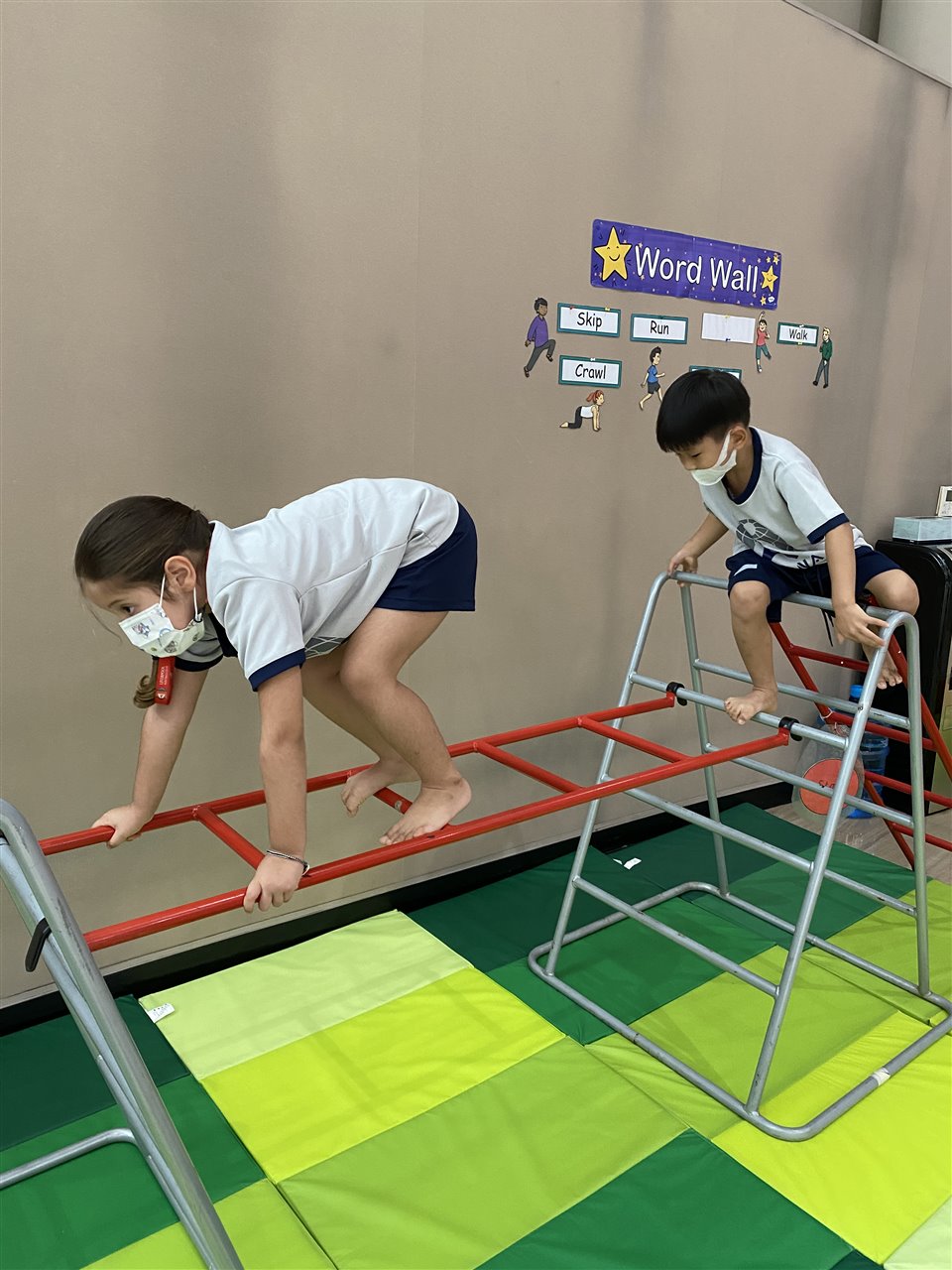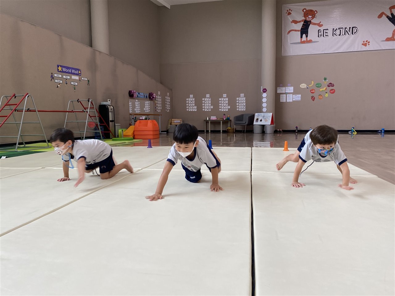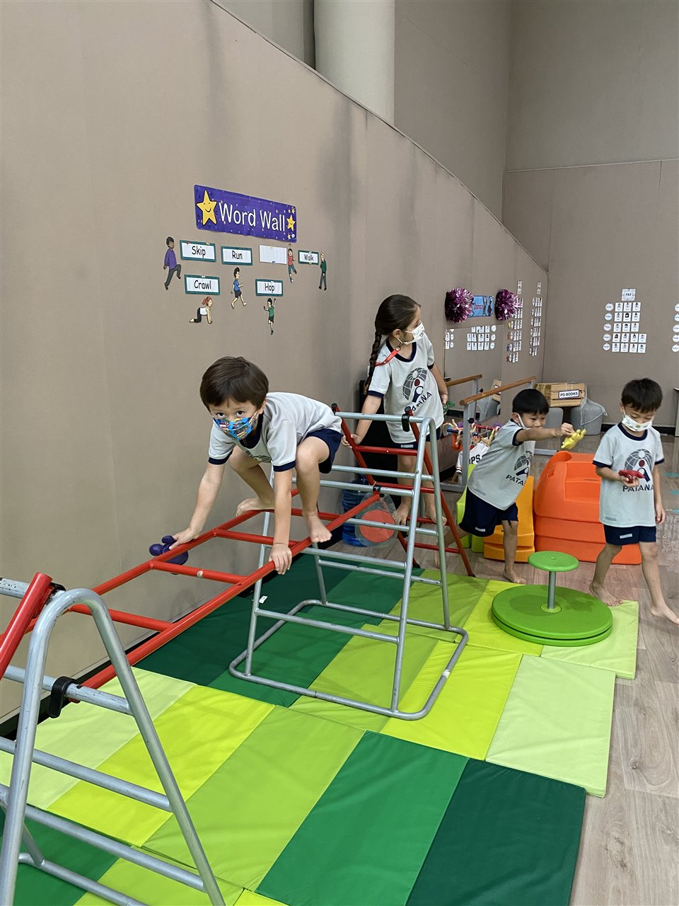 The children loved playing the rainbow balls game. They are asked to move by hopping, crawling and skipping to get the different coloured balls. It was so much fun! After this game, the children worked in small groups to practice these important gross motor skills.