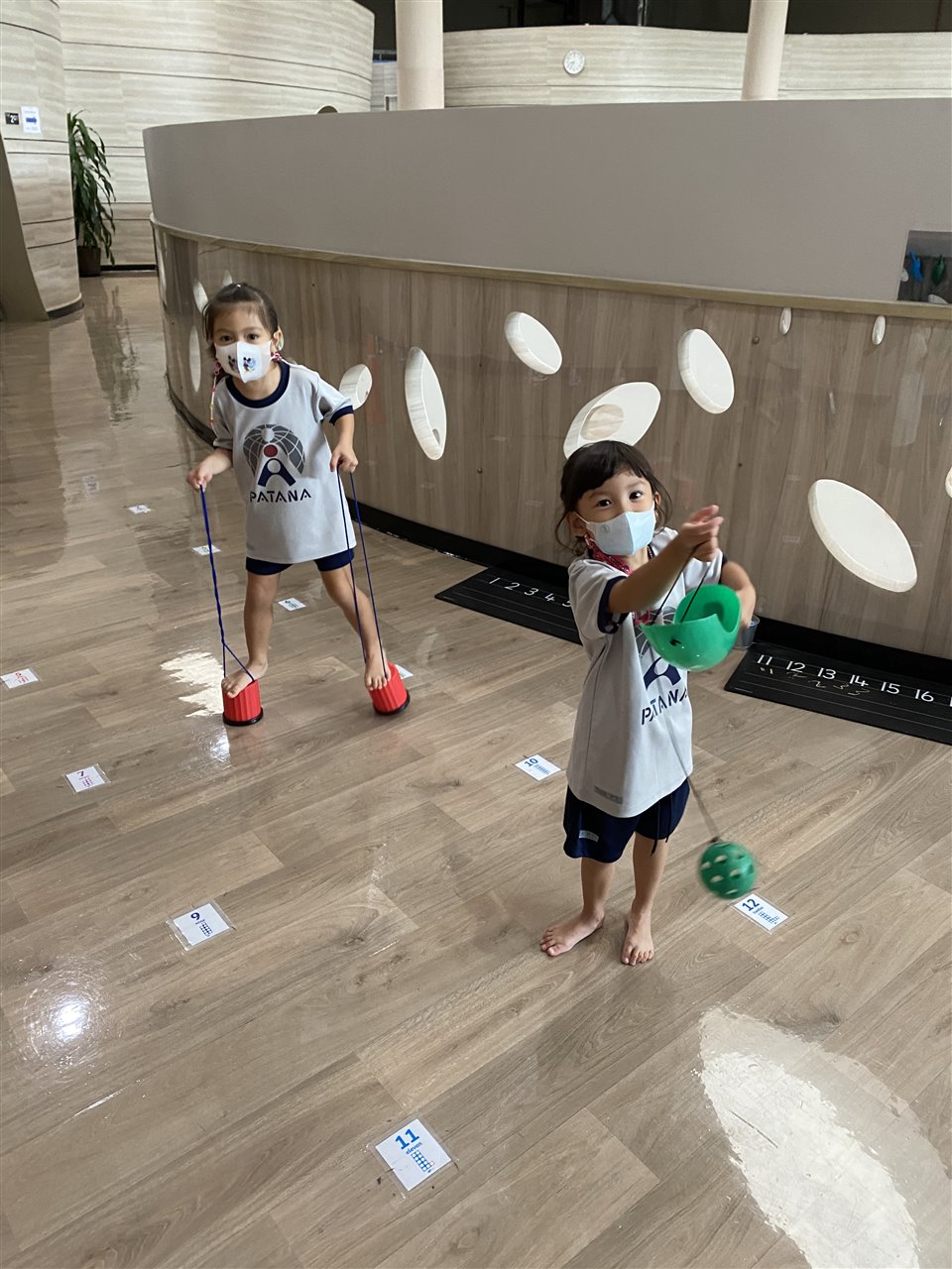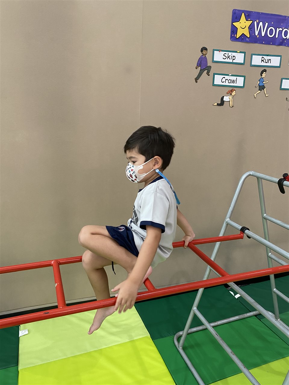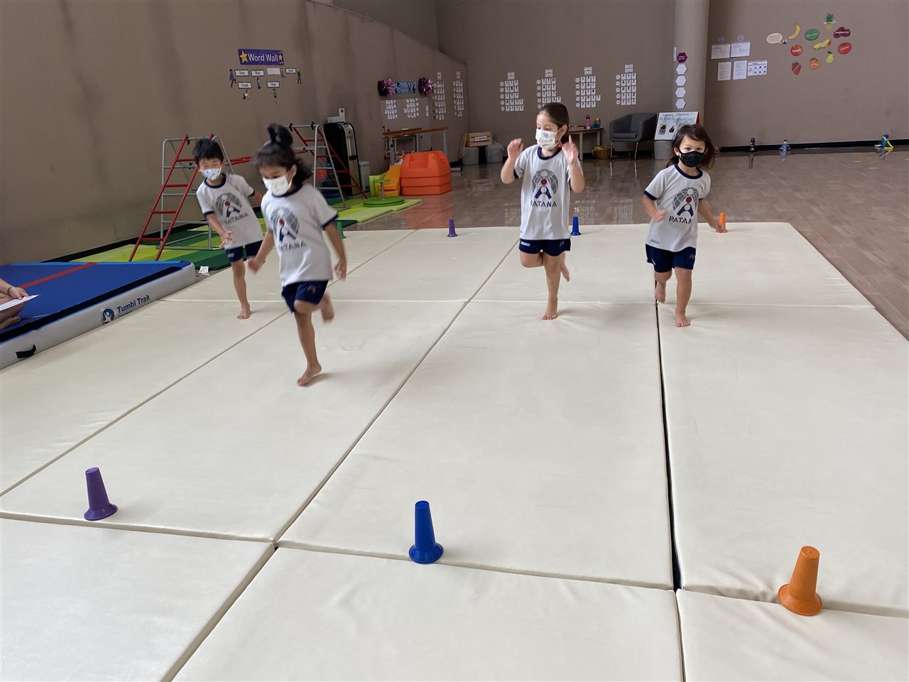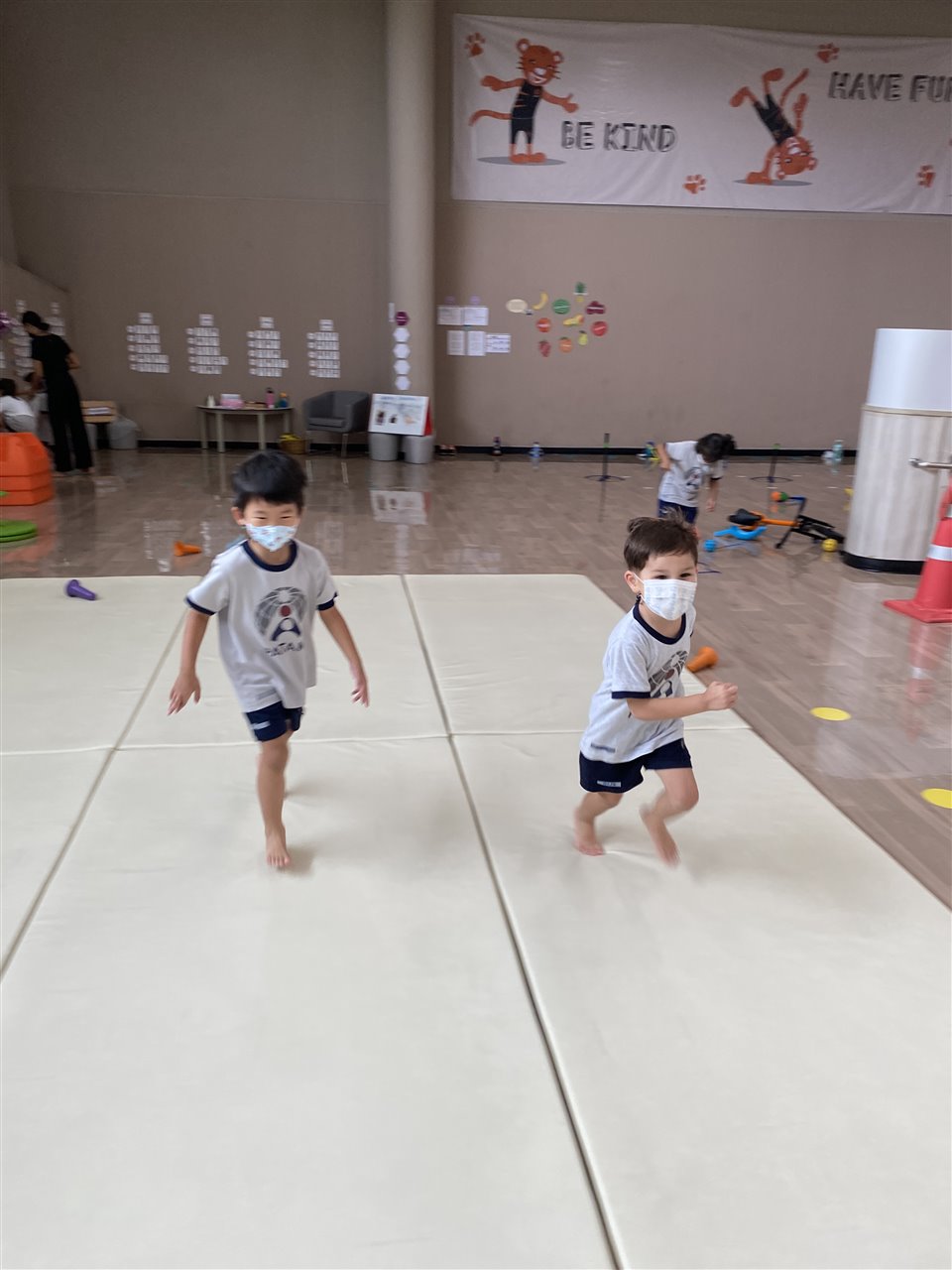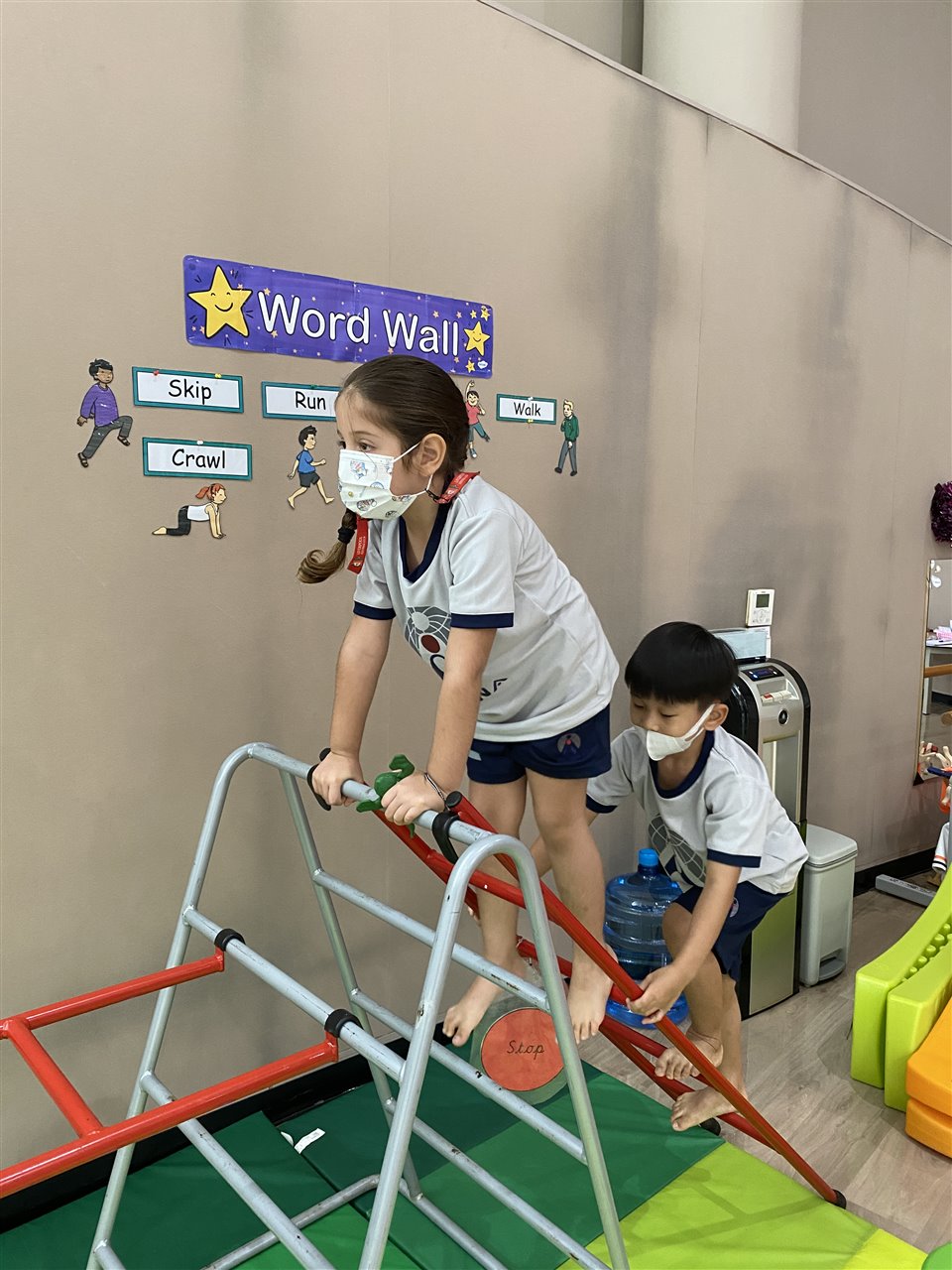 The children loved playing the rainbow balls game. They are asked to move by hopping, crawling and skipping to get the different coloured balls. It was so much fun! After this game, the children worked in small groups to practice these important gross motor skills.