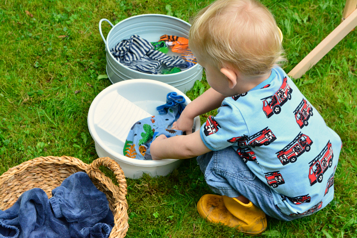 To give this activity context your child could ‘wash’ items like baby clothes, face towels, cars, trucks, bikes, dolls etc.