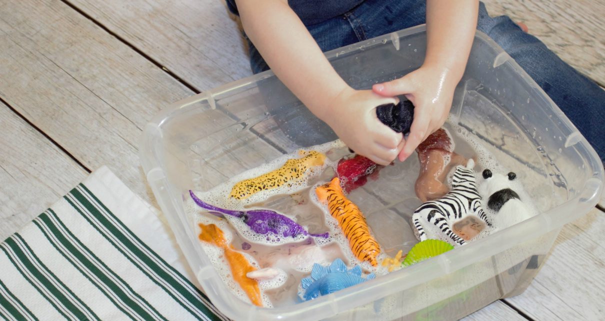 For this sensory play add soap to water and encourage your child to freely explore the properties of soap.