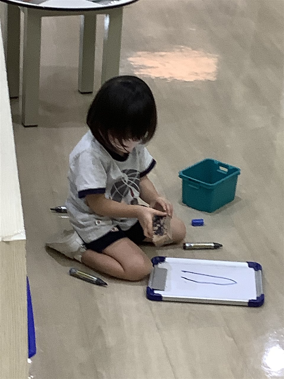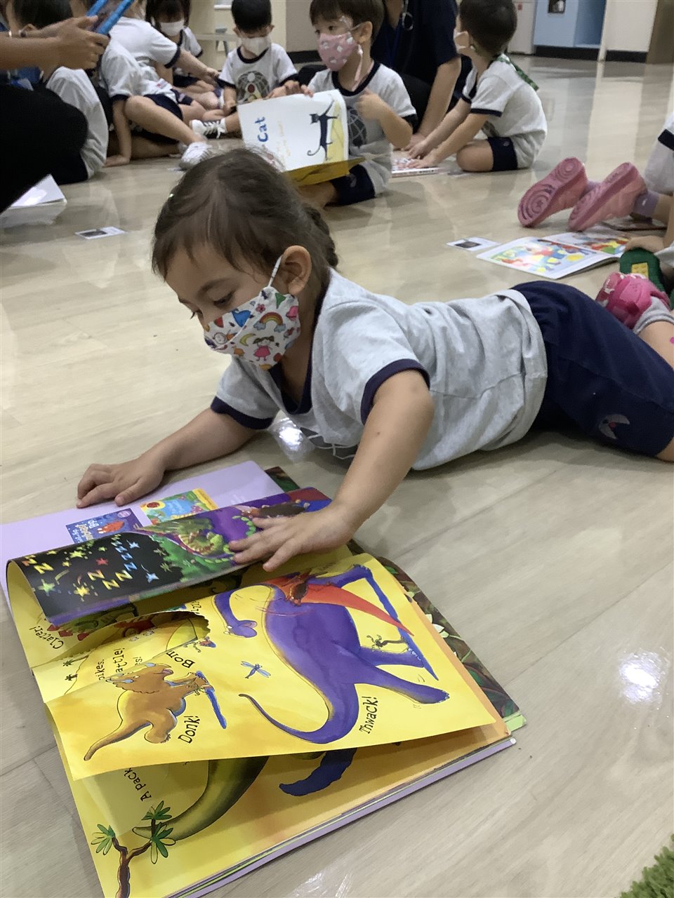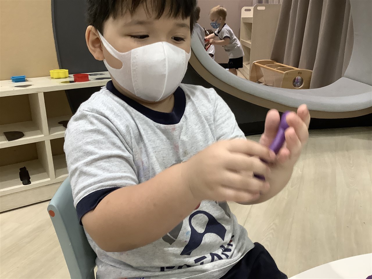 The fine-motor skills involved in putting on (and taking off) shoes and socks are tricky, we help the children as much as necessary but certainly encourage independence. Can you practice with your child? Whilst we do not expect the children put on their socks by themselves, they can practice pulling them up after being helped to put them over their toes.
