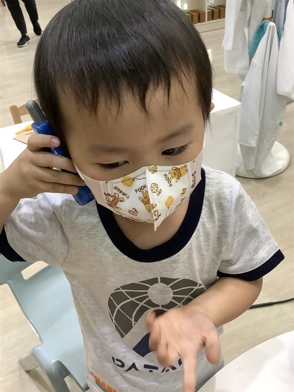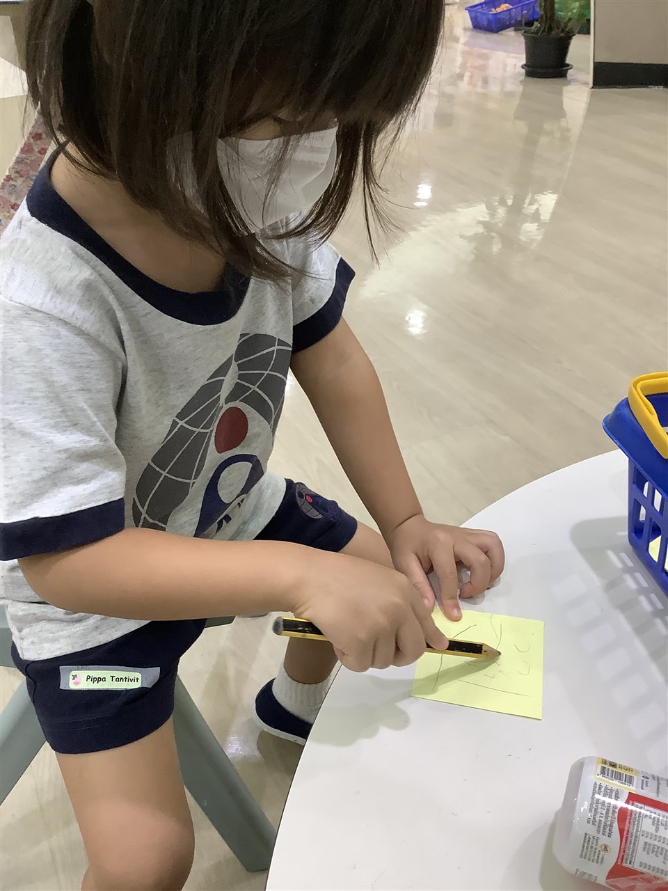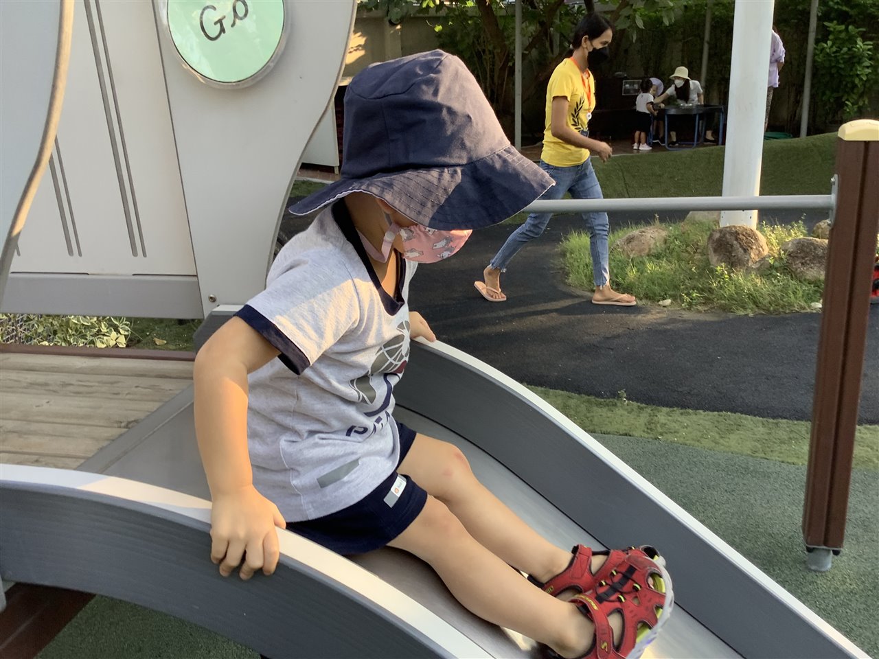 The fine-motor skills involved in putting on (and taking off) shoes and socks are tricky, we help the children as much as necessary but certainly encourage independence. Can you practice with your child? Whilst we do not expect the children put on their socks by themselves, they can practice pulling them up after being helped to put them over their toes.