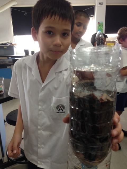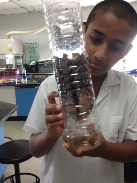 Students collected the waste vegetables and fruit that is discarded during lunch preparations which included Morning Glory stems and Guava Peels. Then they prepared worm gardens using plastic bottles that would otherwise have been recycled or thrown away. They put waste coconut dust (the waste from making a coconut product called coir) and cow dung into their bottles to make the worms some bedding and give them a sustained food source. Then they placed a layer of waste vegetables on the top of the habitat , watered it, and finally, covered it with damp newspaper.
