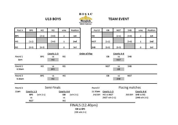 The U13 boys tennis team had a disappointing end to the season losing 1-2 in the final of their BISAC championship to ISB. The boys who were looking to finish the season unbeaten battled hard but lost a titanic deciding doubles 5-7