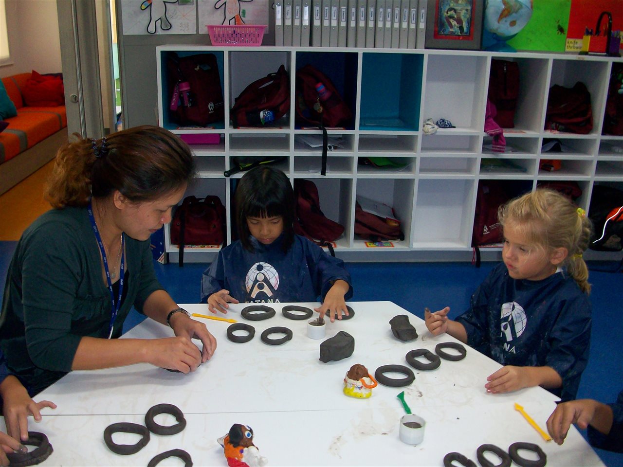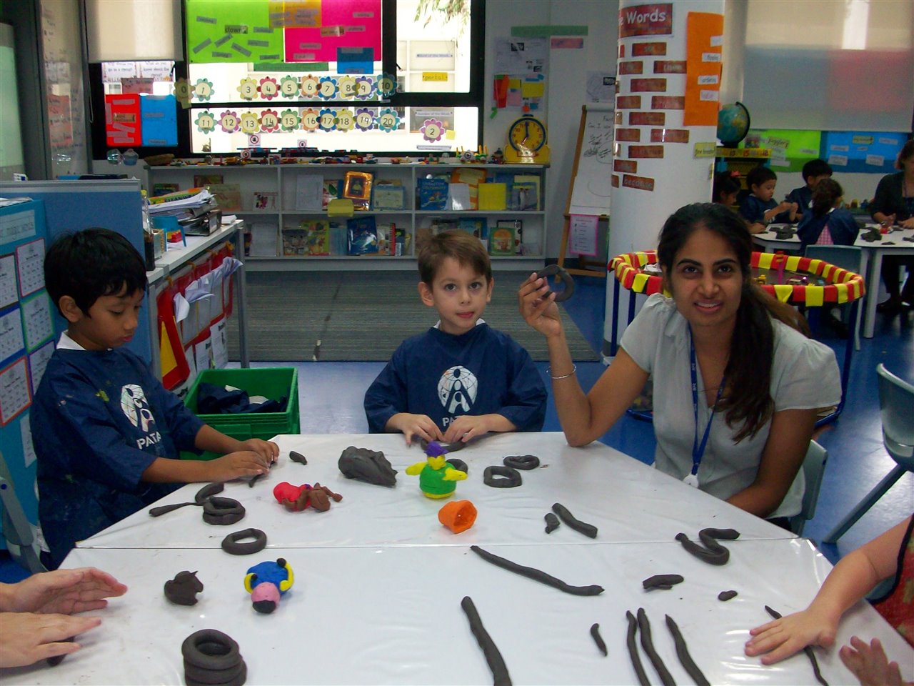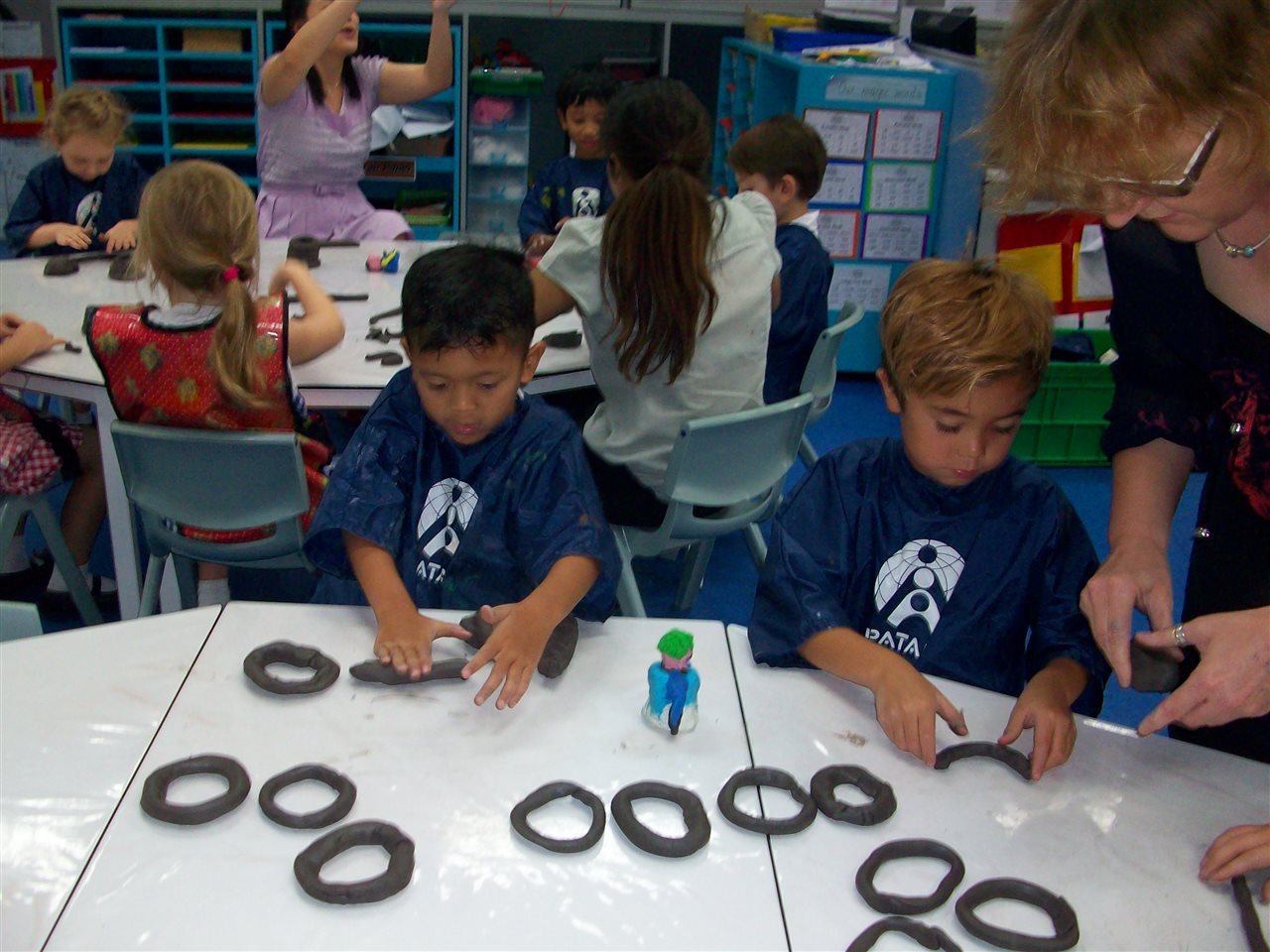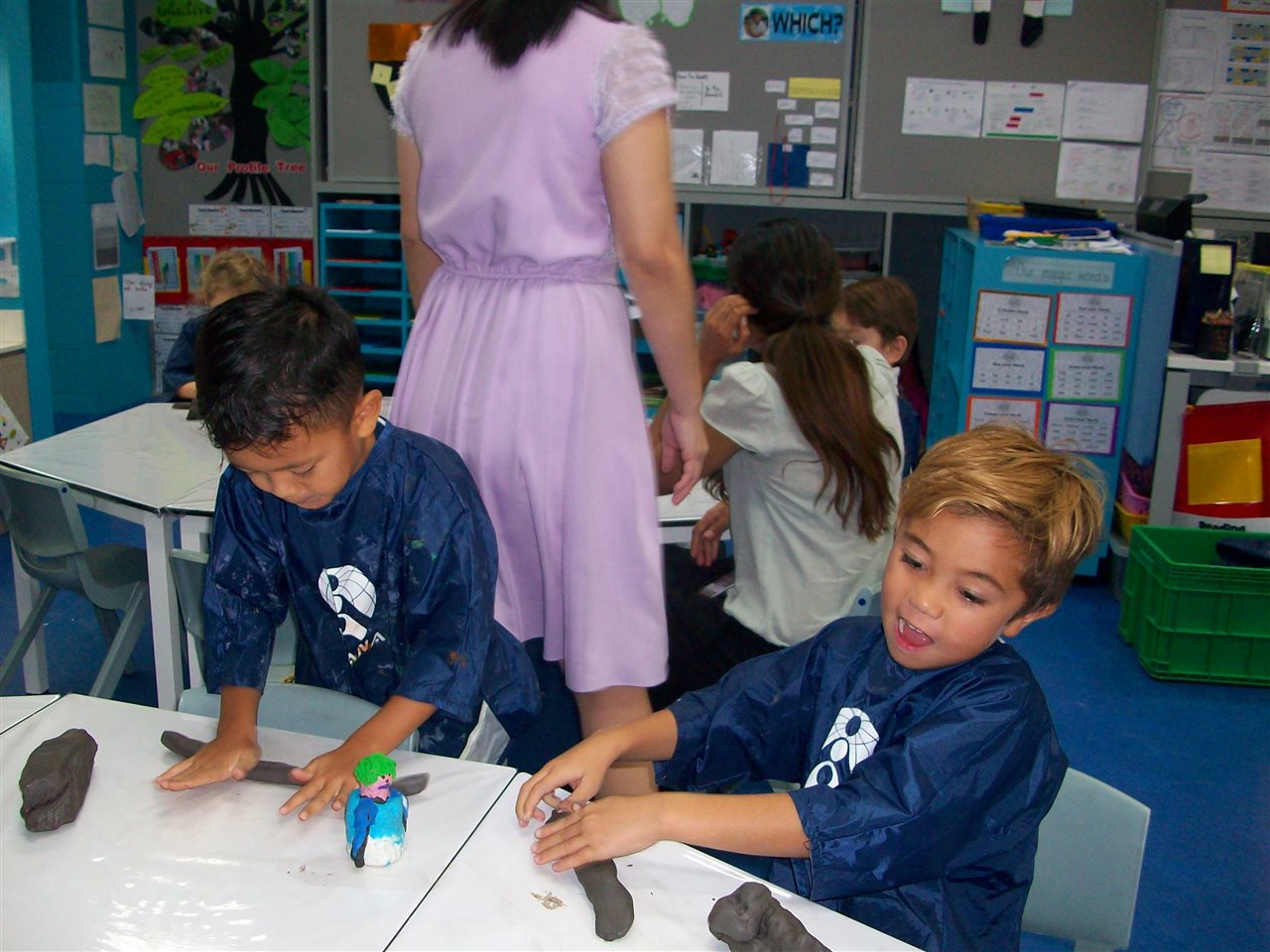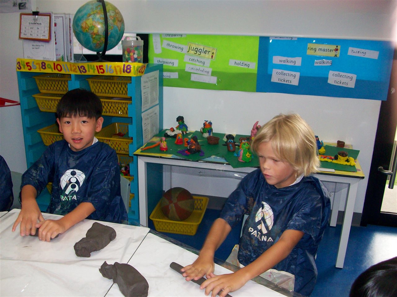 Today the students in 1M and 1B started to make their circus characters out of clay, using the 'donut' method. This entails the students making a series of donut-shaped rings out of clay, then sticking them together with clay glue called slip, then smoothing down the joints. Afterwards we visited the Foundation Stage science Expo!
