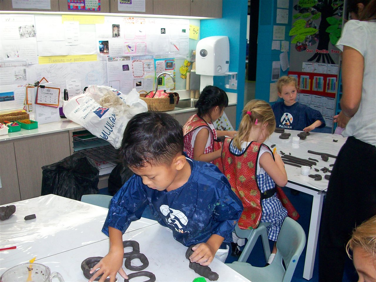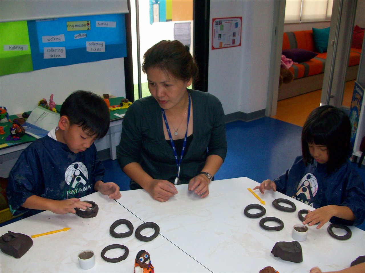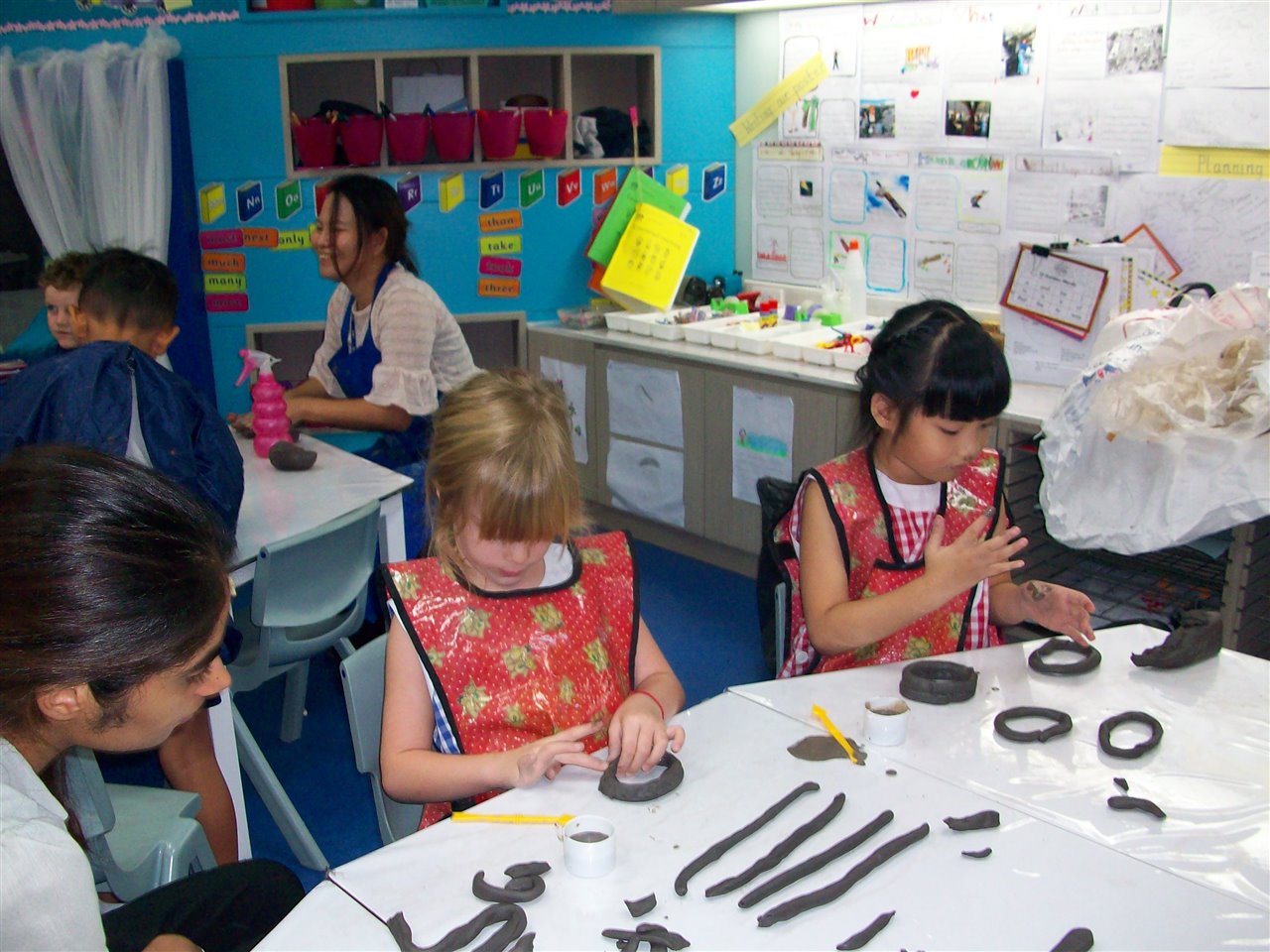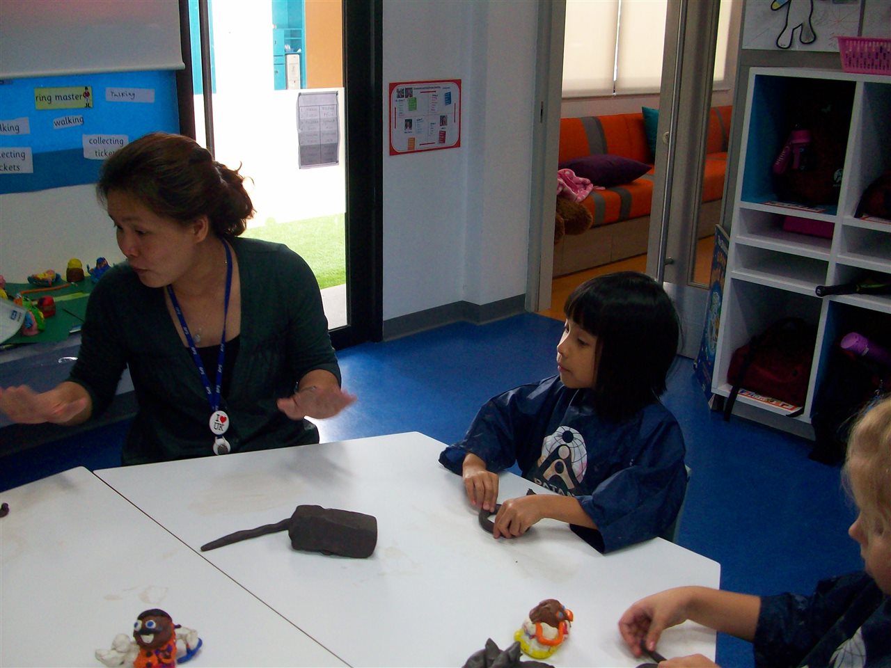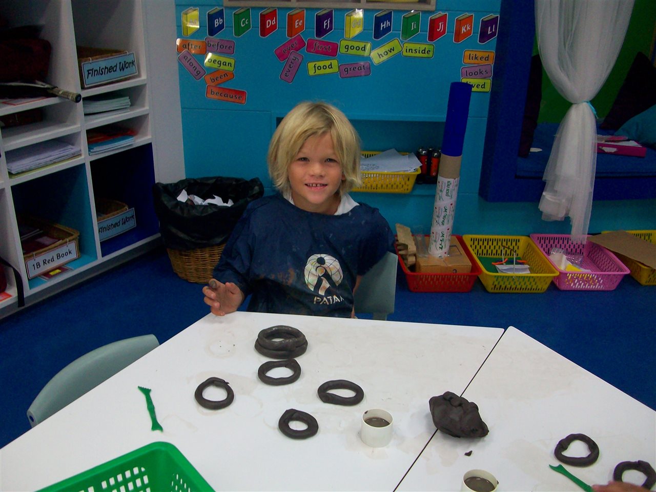 Today the students in 1M and 1B started to make their circus characters out of clay, using the 'donut' method. This entails the students making a series of donut-shaped rings out of clay, then sticking them together with clay glue called slip, then smoothing down the joints. Afterwards we visited the Foundation Stage science Expo!