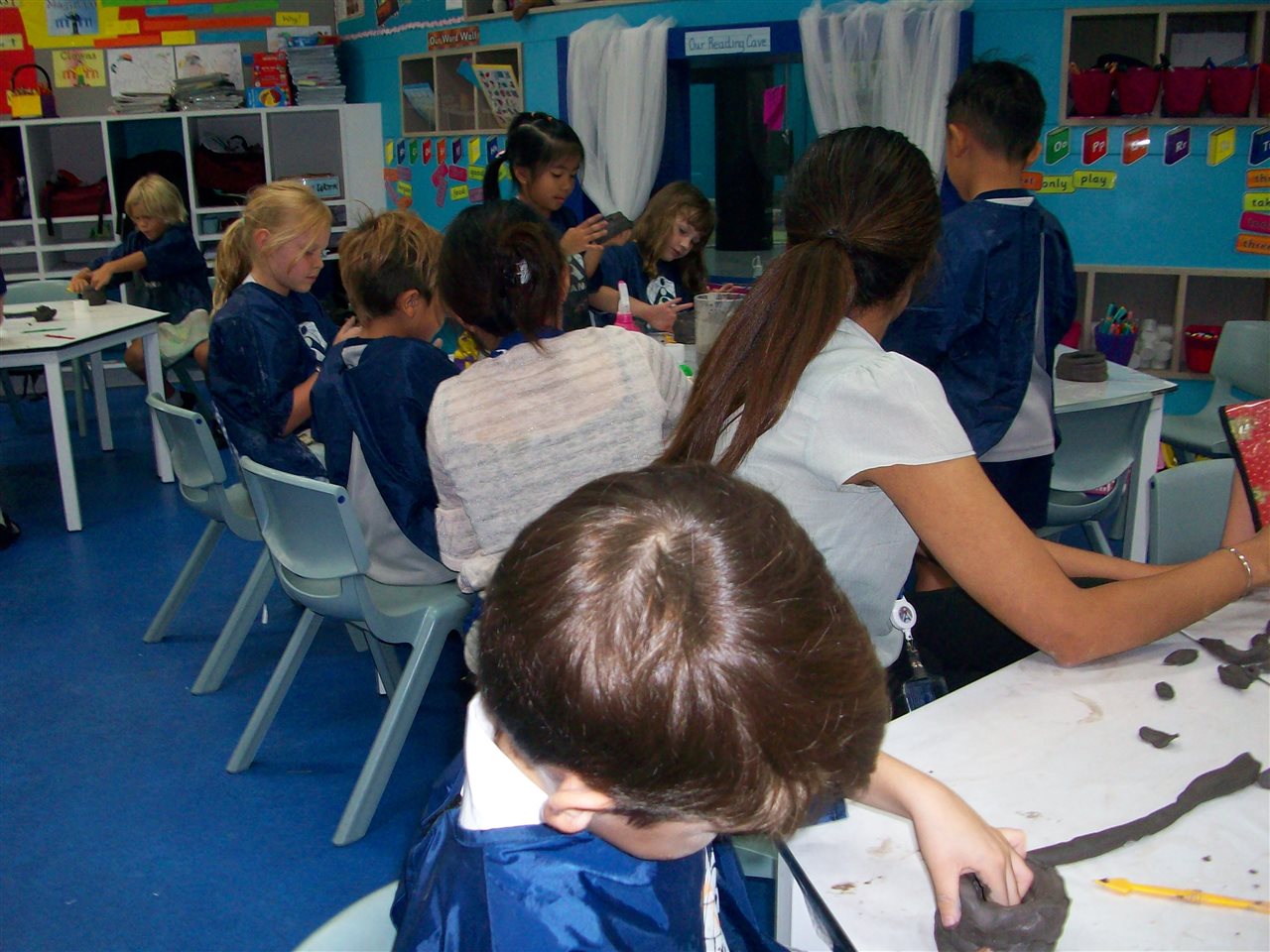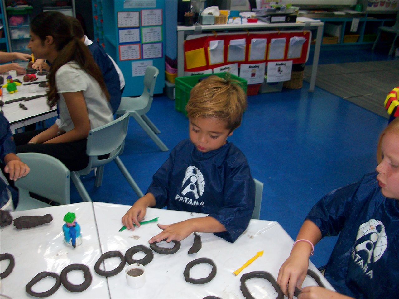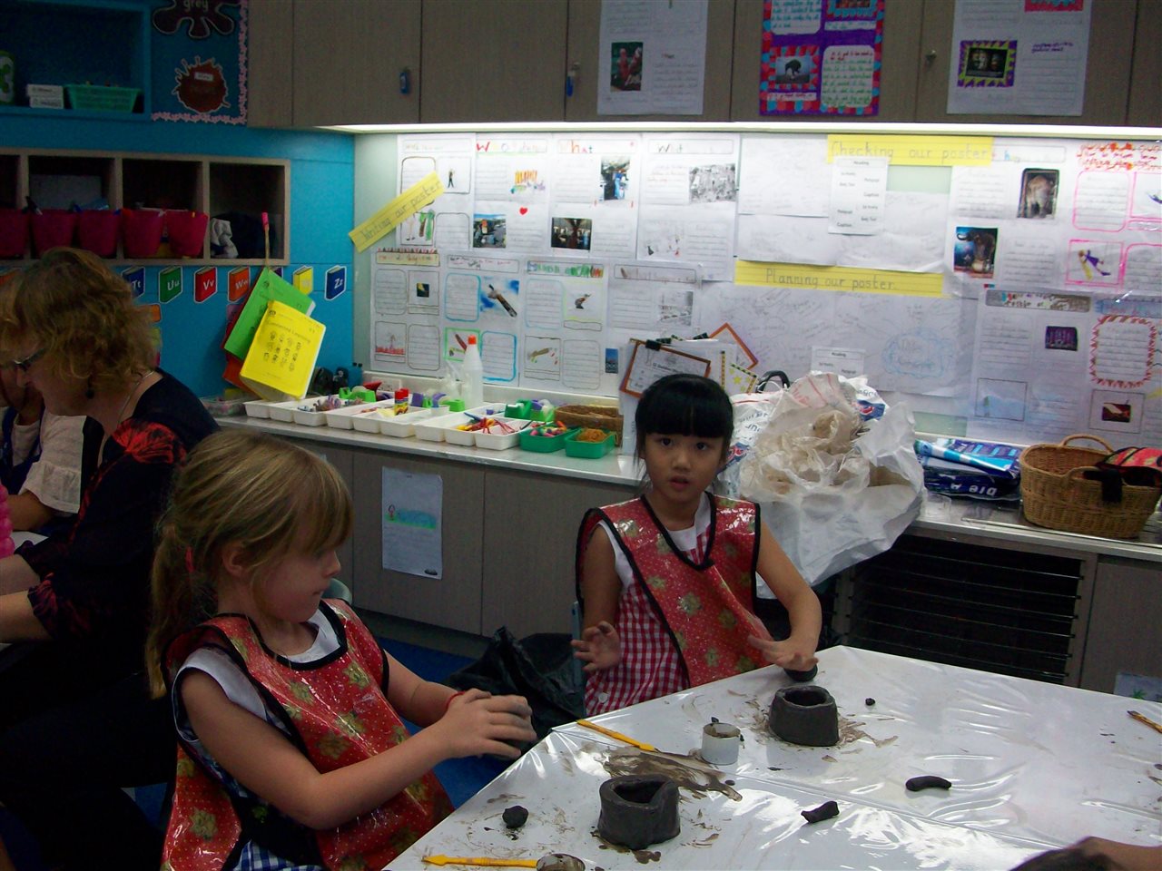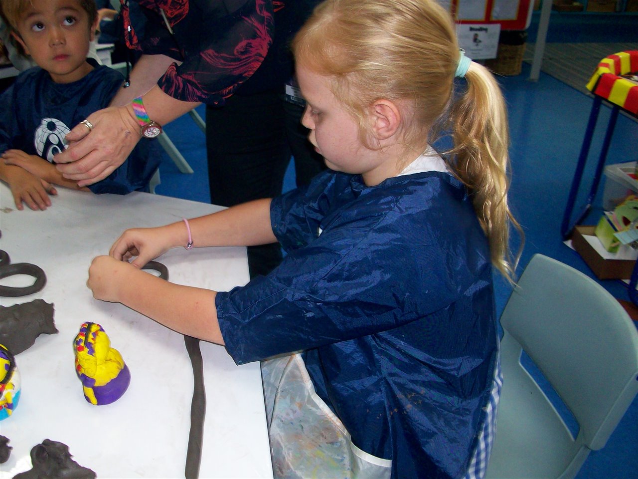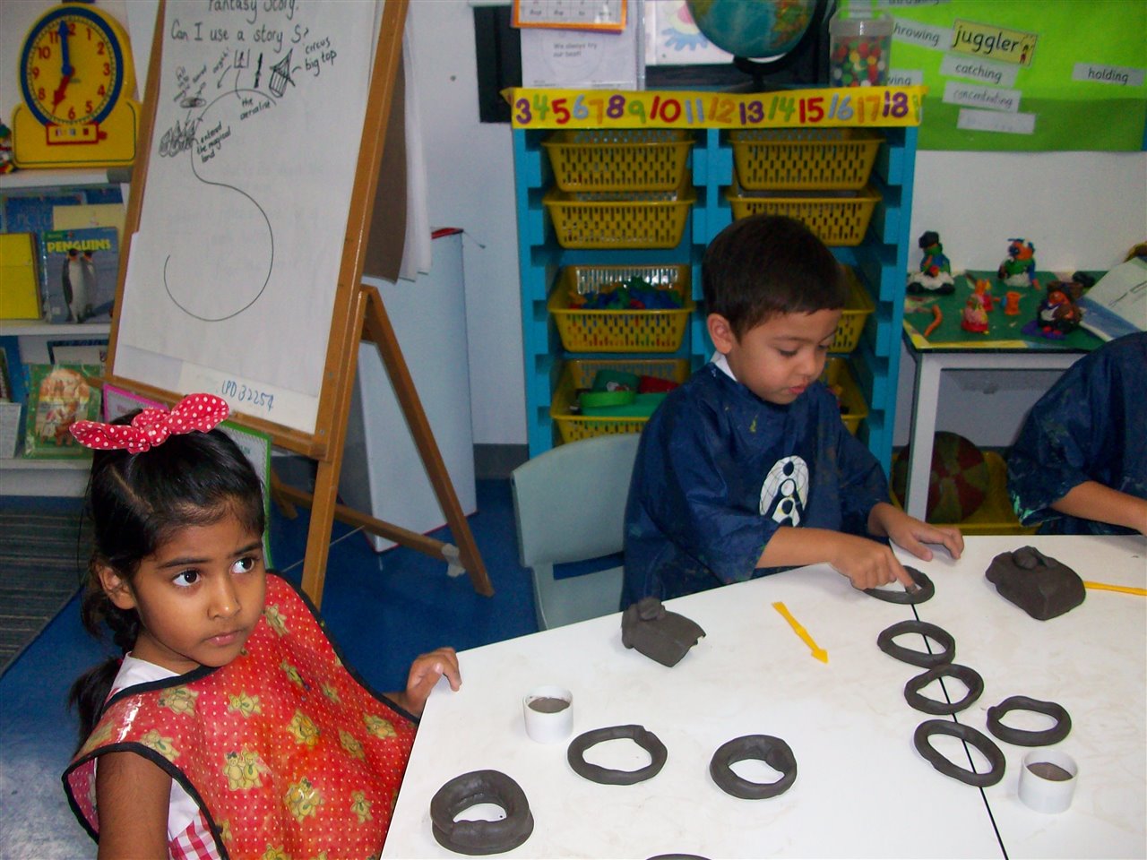 Today the students in 1M and 1B started to make their circus characters out of clay, using the 'donut' method. This entails the students making a series of donut-shaped rings out of clay, then sticking them together with clay glue called slip, then smoothing down the joints. Afterwards we visited the Foundation Stage science Expo!