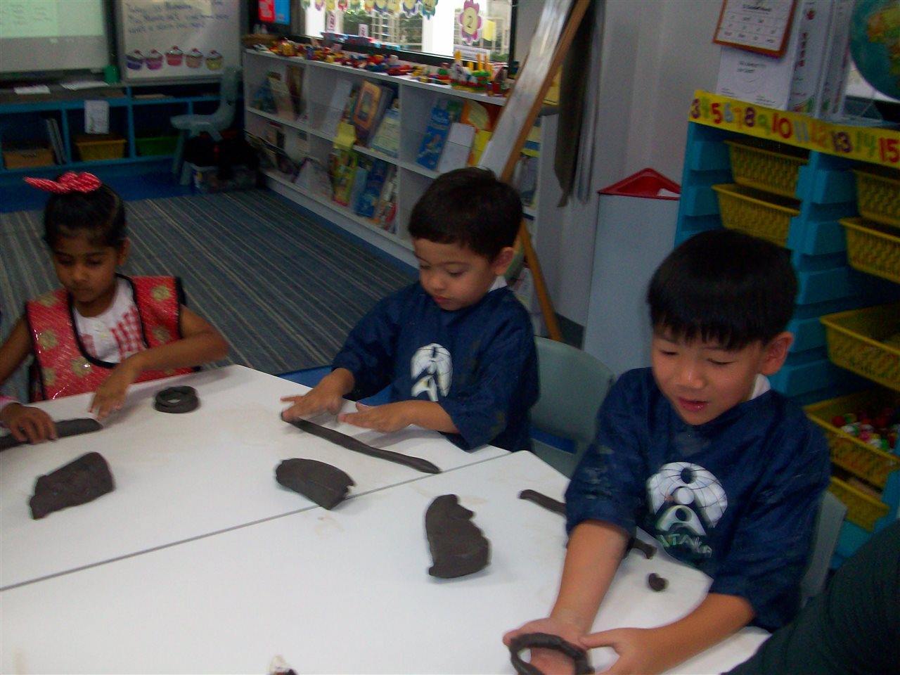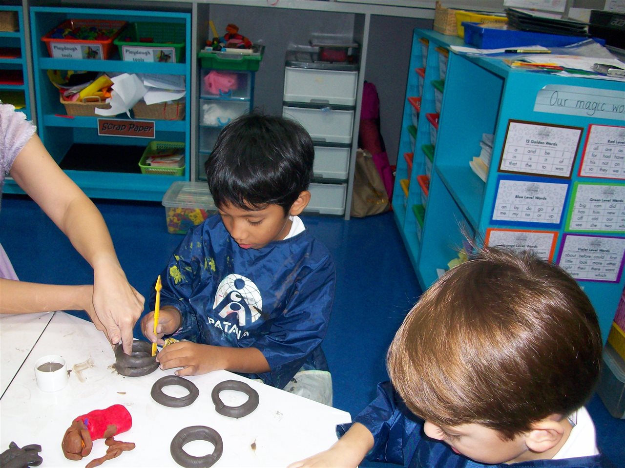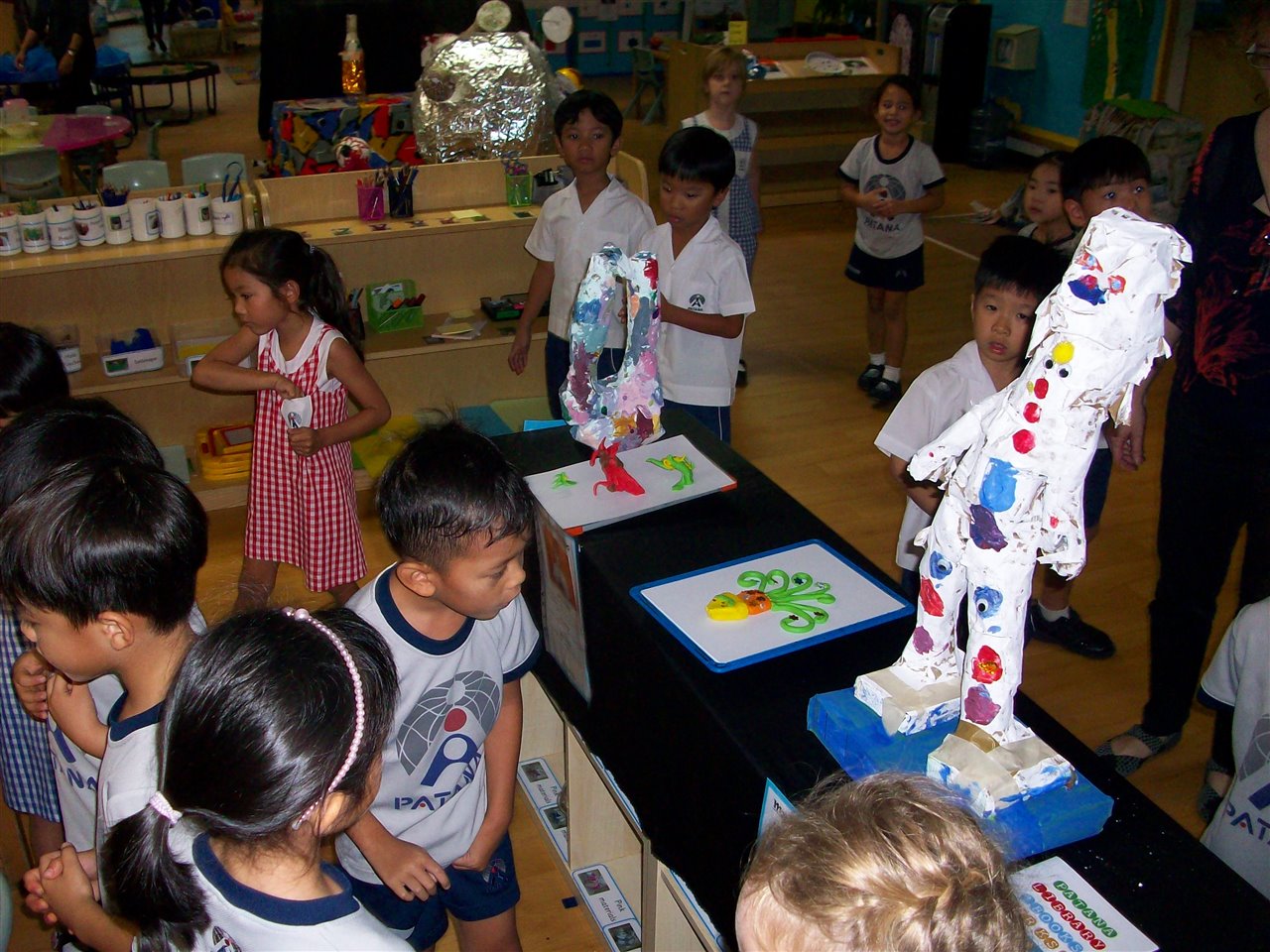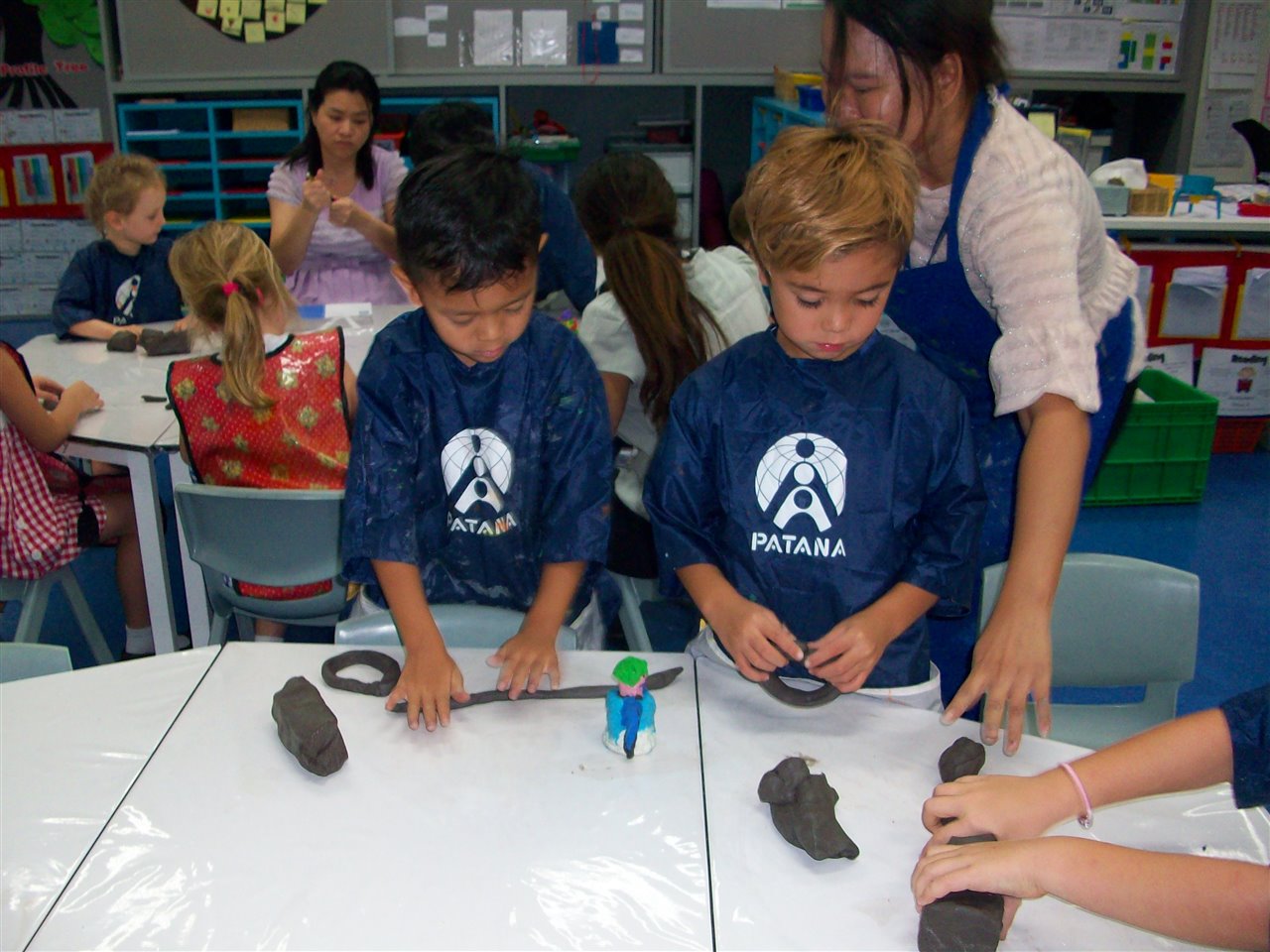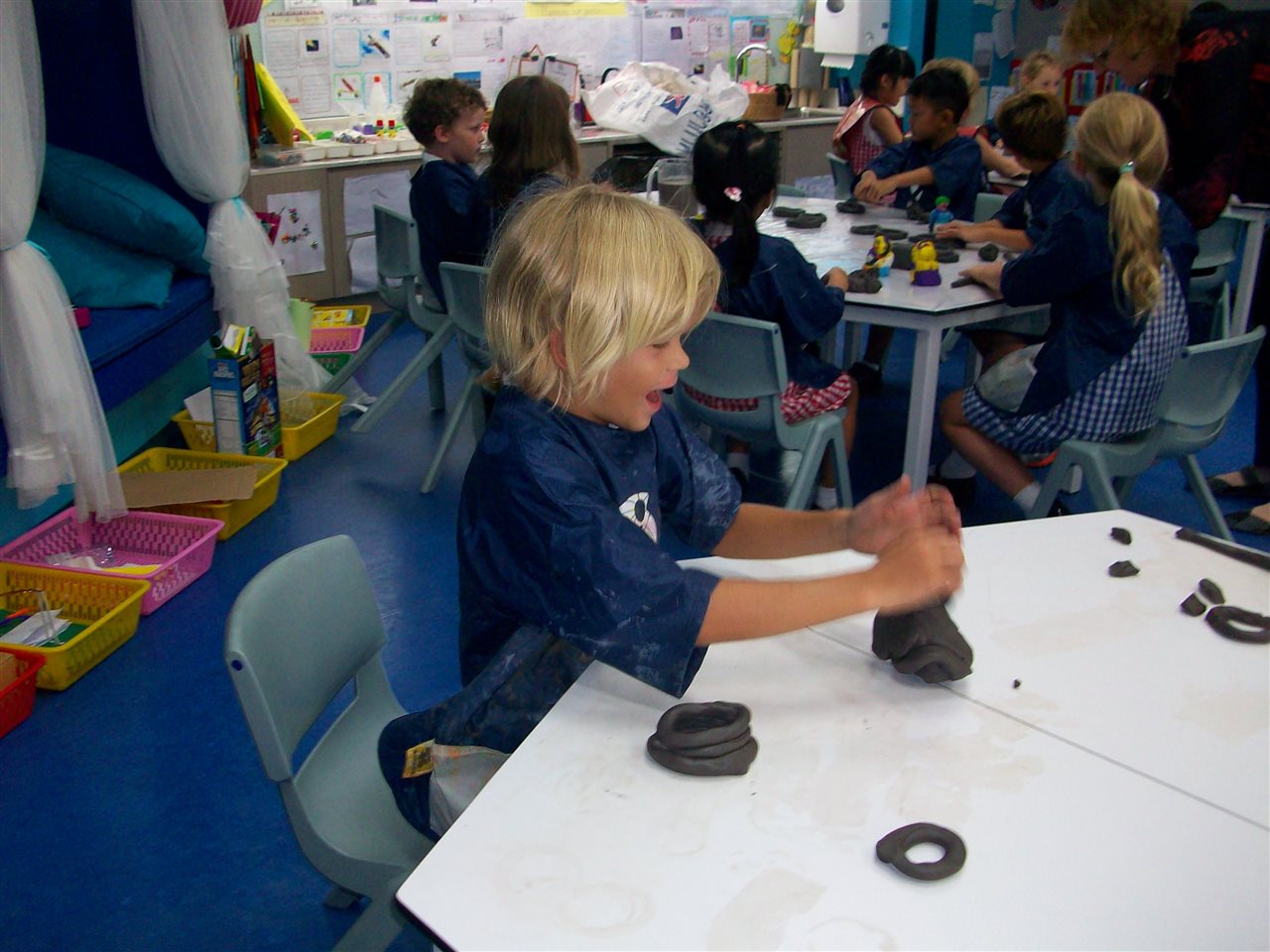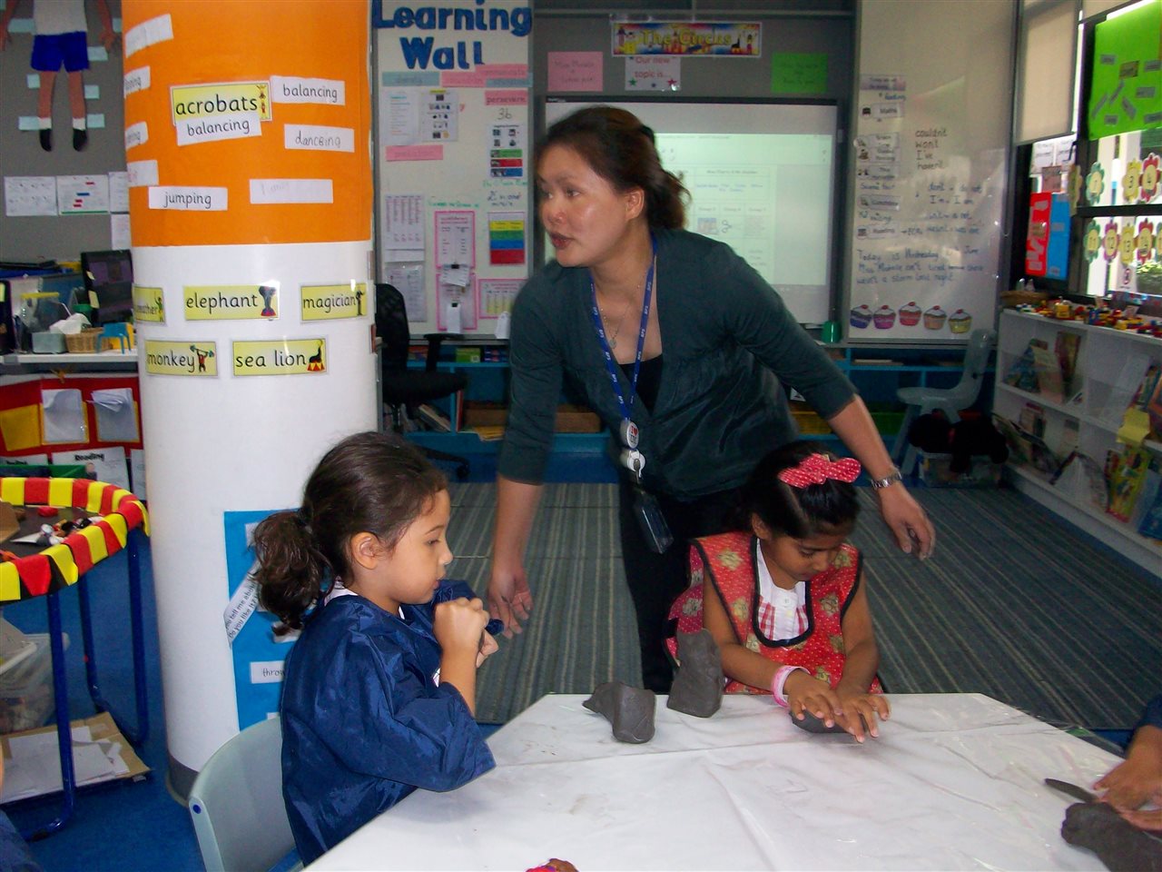 Today the students in 1M and 1B started to make their circus characters out of clay, using the 'donut' method. This entails the students making a series of donut-shaped rings out of clay, then sticking them together with clay glue called slip, then smoothing down the joints. Afterwards we visited the Foundation Stage science Expo!