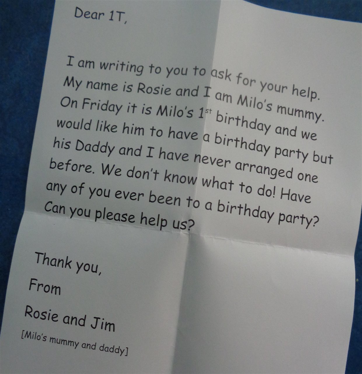 1T have had a busy week as they became party planners after getting a letter from Milo's Mum and Dad......