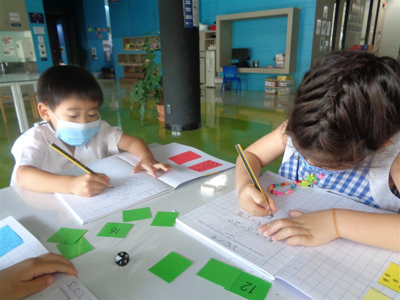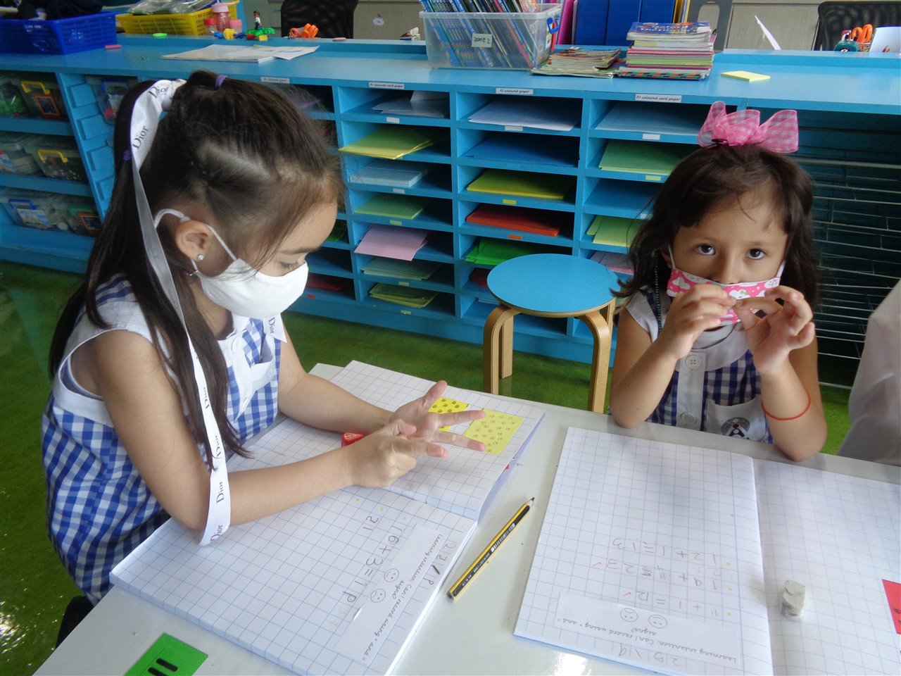 In maths, we were thinking about adding numbers together and the different ways we can say 'add' [count on, plus]. We then practised writing some number sentences in our maths books!