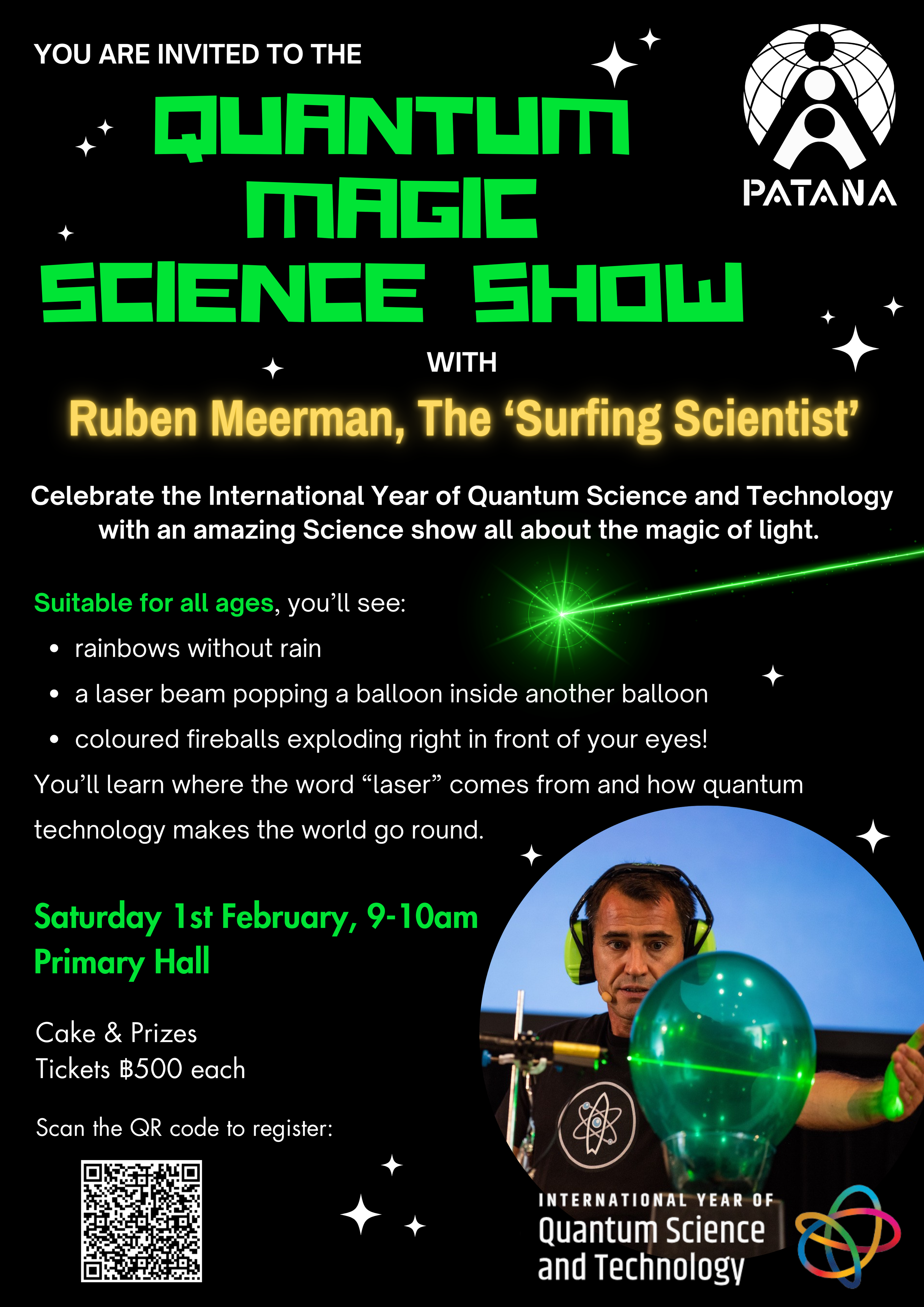 Join us on Saturday 1st February, 9-10am in the Primary Hall for a brilliant Science show (with plenty of magic thrown in) with Ruben Meerman, also known as 'The Surfing Scientist'. Either scan the QR code, or click on this link to register: https://forms.office.com/r/Z0z4bs66mF