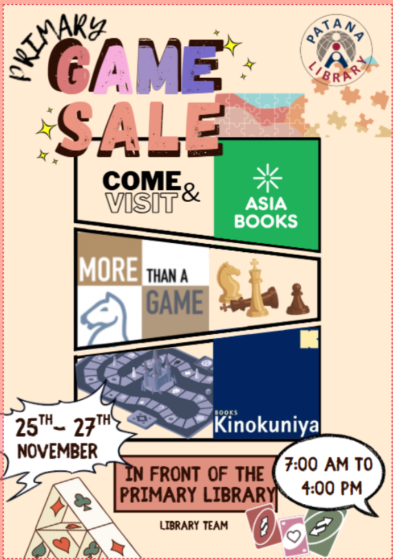 We have our 2nd annual Game Fair in front of the Primary Library next week, between the 25th and 27th November. Please be aware that the children will be able to browse the games before and after school, but not during playtime and lunch time. They are also able to browse the games if teachers decide to bring their classes down for a look.