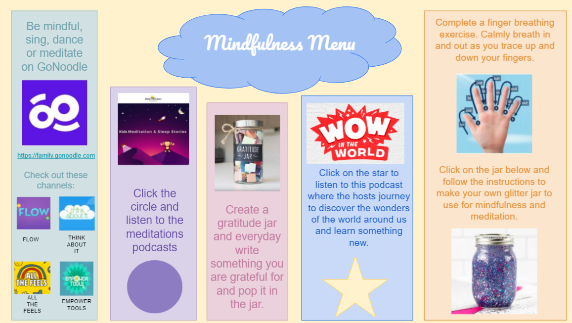 In the resource below, there are links to a range of activities that can help you to be more mindful and to switch off. I wonder which ones you will choose. We look forward to some recommendations in the Exit Ticket.