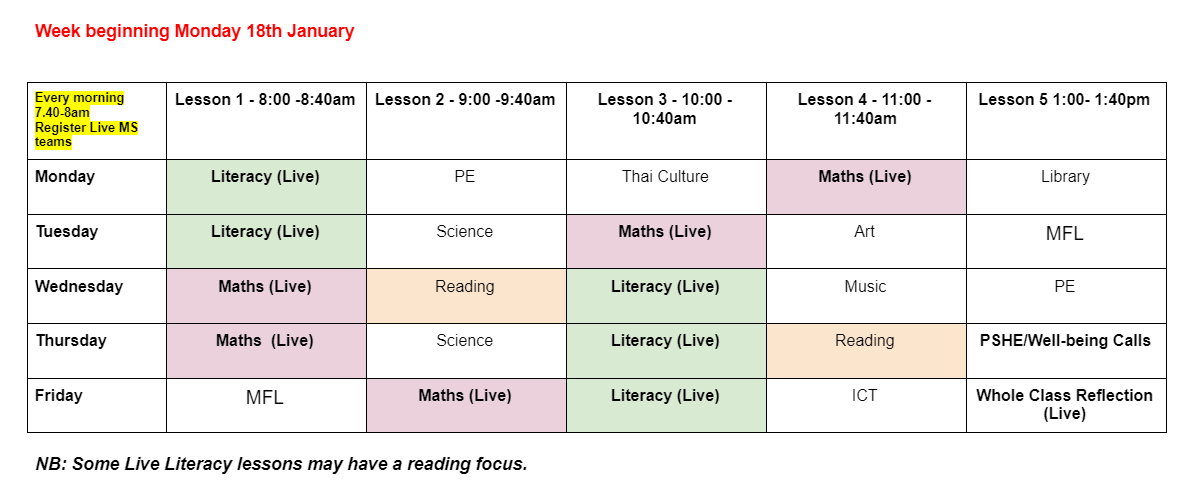Next week you will have 2 live lessons with your class teacher each day plus 1 live Thai lesson and 1 live MFL lesson.