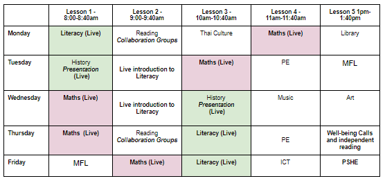 Timetable - please note the changes to the timetable. This week, your History Project presentations will take part during our live lessons.