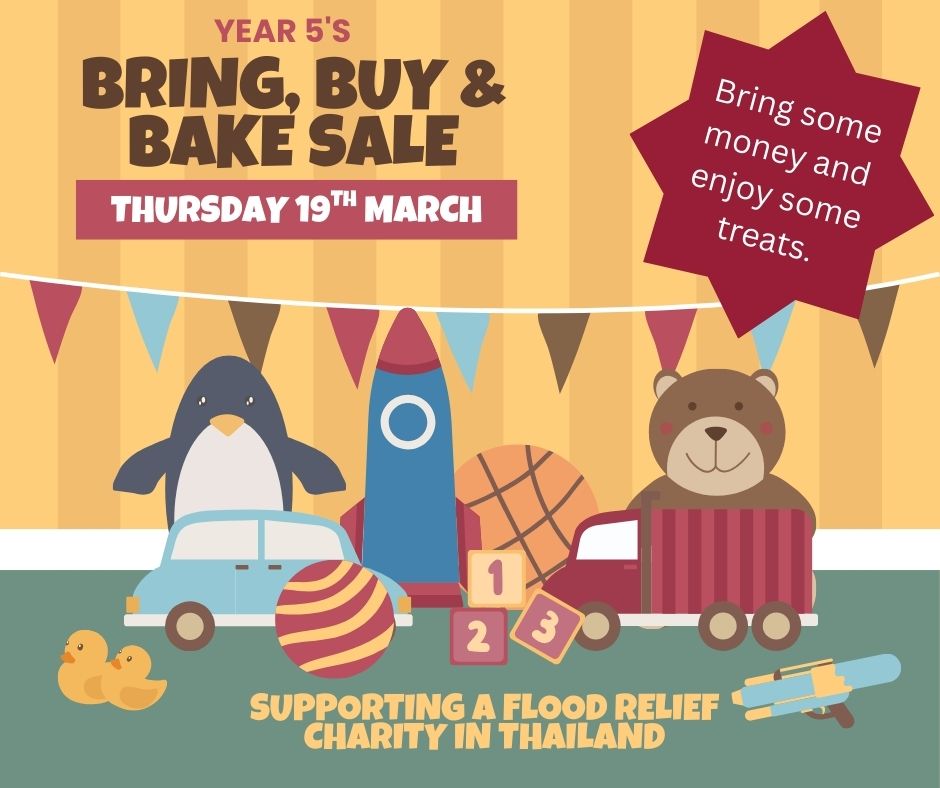 A reminder that next Thursday, Year 5 will be holding a Bring, Buy and Bake Sale to raise money for those affected by floods in Thailand.