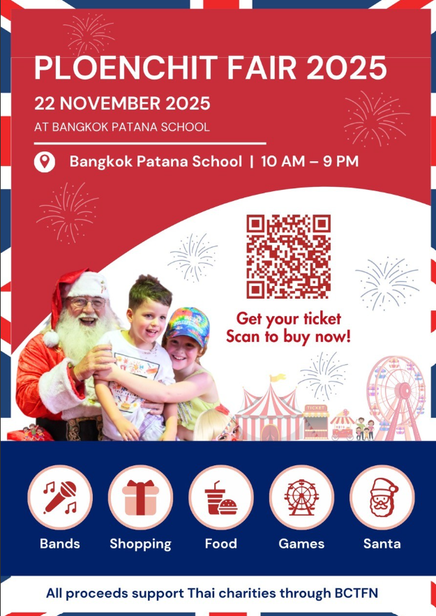 The Ploenchit Fair will take place at Bangkok Patana School, with rides, games, stage entertainment and food. Santa will drop by for family photos and a range of vendors offer an opportunity for you to get some unique Christmas gifts. The fair runs from 10.00am until 9.00pm and you can purchase tickets at the gate. www.ploenchitfair.com All proceeds of the fair go to the Thai charities.